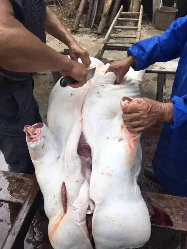 猪血放完了,爷爷、奶奶和屠夫把黑猪抬进大木桶里,一勺勺的开水浇下去,一会儿功夫猪身上的毛用手就能拔下来了。屠夫拿出刮猪毛的工具,一边刮着,一边用水冲洗,慢慢地褪了毛的大黑猪成了光光的大白猪。