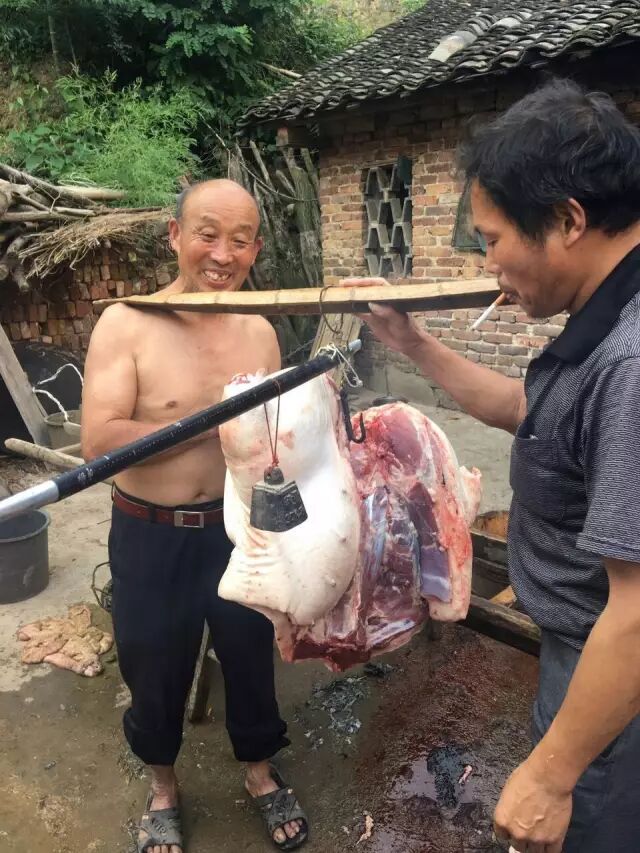 一大早,奶奶就把平时煮猪食的大铁锅洗得干干净净,烧上满满一锅热水,爷爷和村里的屠夫从猪圈里把黑猪赶了出来。只见屠夫用一只铁勾勾住黑猪的嘴在前面拉,爷爷把着猪尾在后面推,黑猪知道“大祸临头”,使劲往后退,一时间好不热闹。精疲力尽的黑猪被拉到事先放好的两条长凳前,爷爷和屠夫一使劲,便将它推翻在长凳上。只见屠夫拿起杀猪刀朝黑猪喉咙处一捅,一股血箭冲了出来,落到事先准备好放了盐的大盆里。黑猪惨烈的叫声由大变小,再后来哼哼两声没了动静,只有腿还不时蹬一下。