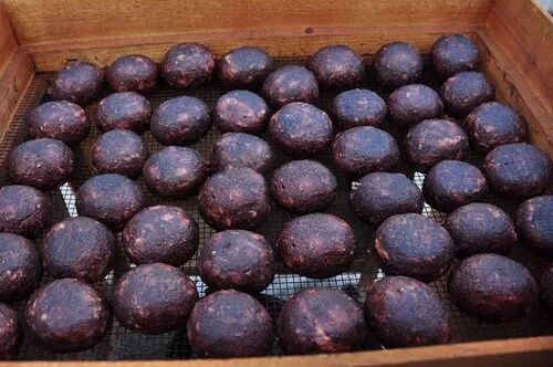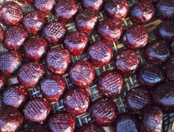另一种是用一个特制铁架子,架子下面用旧铁锅焚烧锯木灰、柏树枝、花生壳进行熏烤,不过这种熏法特别讲究火候,不可过急过猛,否则猪血丸子容易开裂或内部成蜂窝状,影响口感。经过几天的文火慢熏,猪血丸子的表皮变成黑褐色,熏干便可以食用了。