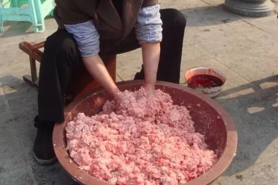 首先把豆腐放在盆里用手捏碎,然后用一块大纱布包好捏碎的豆腐挂起来滤水。滤干水份的豆腐和猪肉条、猪血、盐放在盆里用手使劲搅拌,豆腐被猪血染成了好看的粉红色。充分拌匀后,用一只碗舀起豆腐放在手里左右拍打,慢慢地拍成一个椭圆形丸子(小编尝试过N多次,做出来的总是巨难看,这确实是个技术活)。快拍好的时候还要抹些菜籽油在上面继续拍打几下,这样做出来的猪血丸子油光发亮。