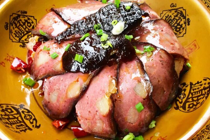 将寸石黑猪猪血丸子用热水洗净切片,和熏好的腊肉、腊鱼一起上锅蒸熟,这就是著名的湘菜“腊味合蒸”。