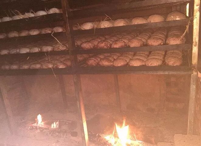把拍好的丸子整齐码放在铺好稻杆的竹匾上,让冬日的暖阳和微风让它们慢慢风干,几天后,就可以熏制了。熏制的方法有两种,一种是将猪血丸子挂在家里烧柴火做饭的灶台上,让烟火慢慢熏着,时间越长,腊香味越浓。