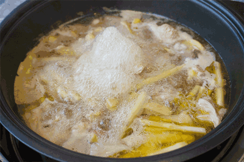 5、炖鸡的水大火烧开,小火炖两小时后,再放入竹荪炖半小时就差不多了