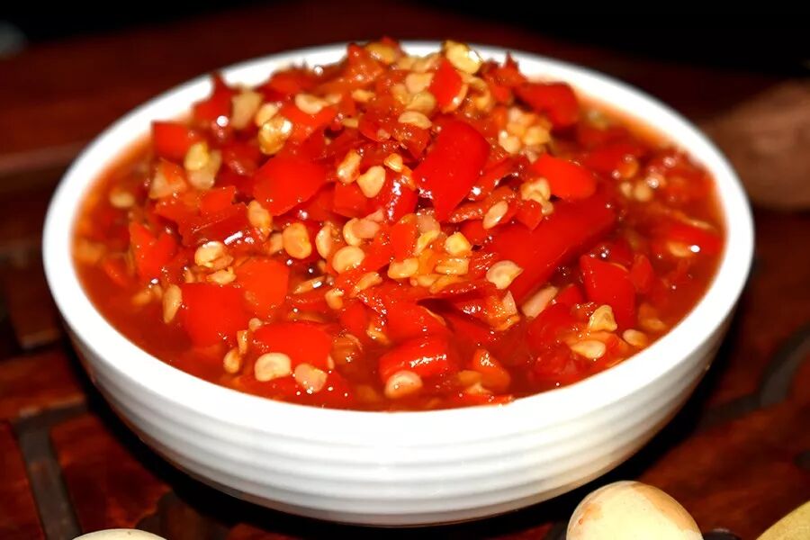 湖南人最普及的辣椒加工制品是剁辣椒,红艳艳的辣椒碎末,很是惹人嘴馋。经过加工后的剁辣椒,最大限度地保留了鲜椒的鲜、香、脆、辣等原始口感,在腌制过程中又去除了生涩味和生青气,增添了部分微酸,渗透出甜的口味和糖分,适宜我们直接食用或者添加到其他菜肴中。