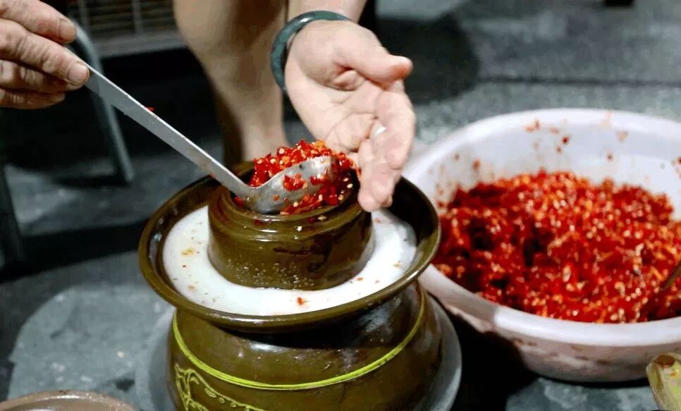 湖南人叫剁辣椒,喜欢叫剁辣子、坛子辣椒。因为收藏久,或者水分少的缘故,辣椒颜色暗红,口感不酸。剁辣椒的加工简便,家家户户都可以生产,人民选择辣味浓重、干物质较多的鲜红辣椒,去除杂物,剪除辣椒蒂,洗净、晾干,剁成碎片,然后按一斤辣椒一两盐的比例,加少许米酒,淹制在陶瓷坛子里。坛口有水槽,扣上盖,放冷水,剁辣椒完全隔绝空气,辣椒不会腐烂,进行自然发酵。做好的剁辣椒放置在阴凉的地方,发酵后的剁辣椒微酸,辣味柔和,吃起来爽口微甜,很清脆,很有口感。一个月后剁辣椒已成,即可食用。