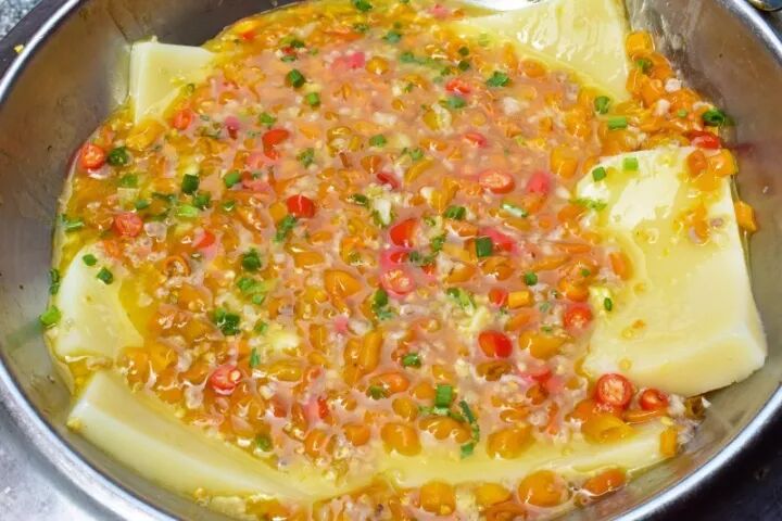 2厘米见方的淡黄色米豆腐和切割成块的深棕色皮蛋,加上红艳艳的小米椒和绿绿的香葱,各种颜色的搭配就很让人惊艳。经过大厨的妙手烧制,软滑的米豆腐和Q弹的皮蛋相互交融,小米椒的加入让这道菜更是香辣可口,美妙绝伦。